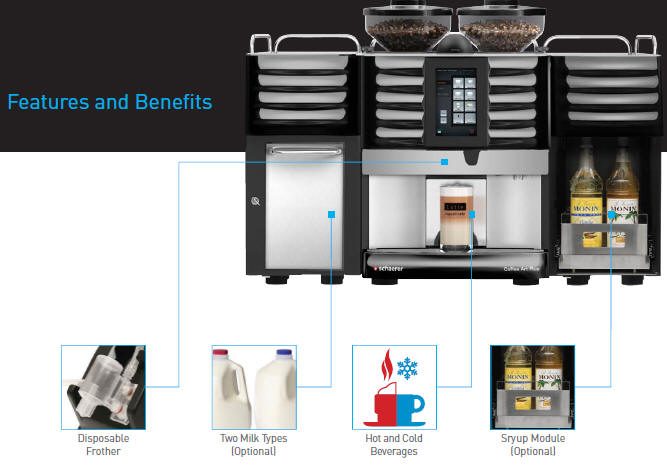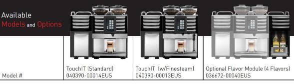 • 100-120 cappuccinos/lattes per hour (16oz cup) • Optional fl avor module allows up to four fl avors • Optional steam wand steams 32oz of milk in 1 minute • Compressor driven refrigerator accommodates 2 gallon jugs • Two bean hoppers with dedicated grinders each hold up to 2.2 lbs.